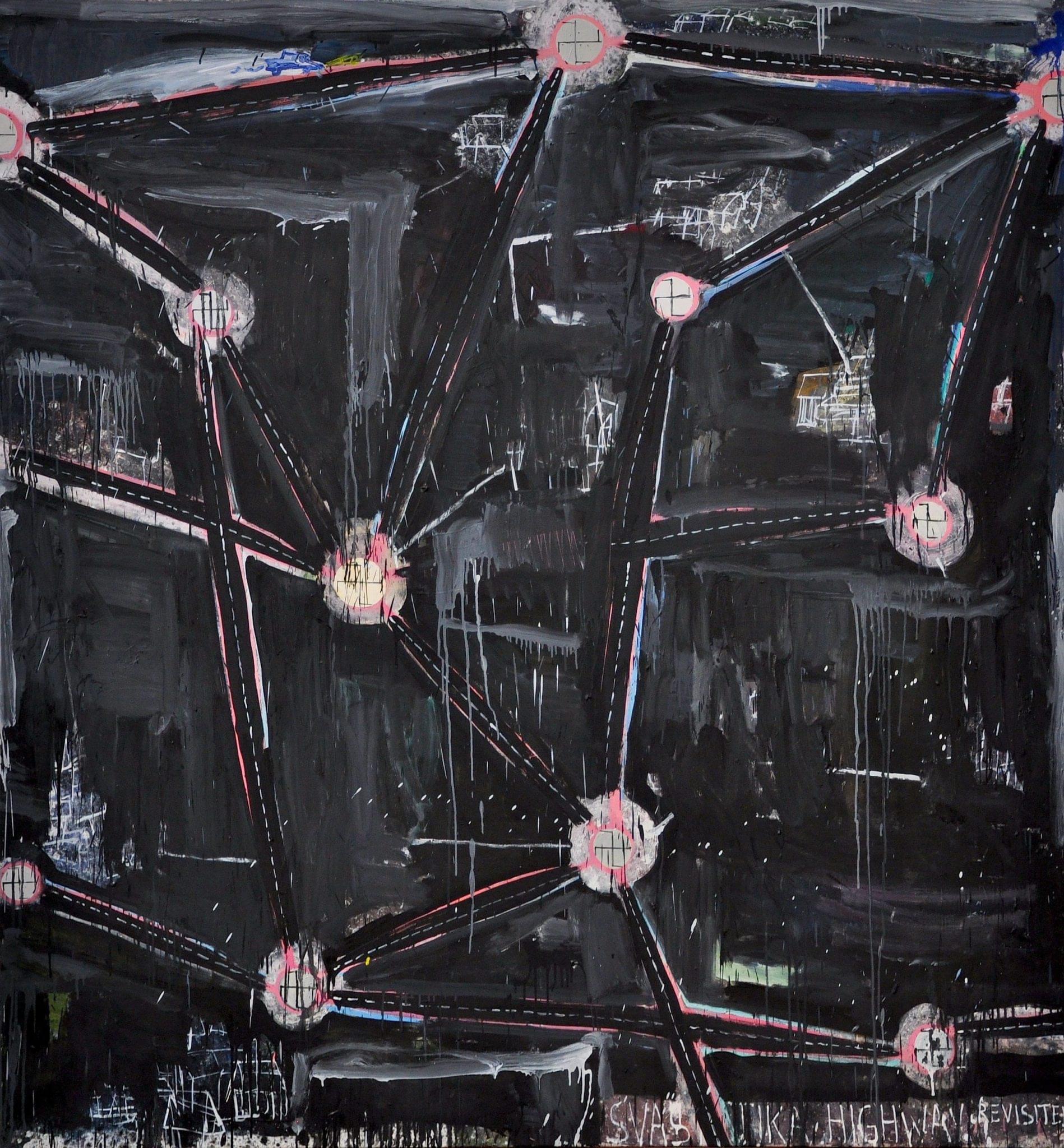 Among the most compelling turns in Vandenberg’s process was the mutation, over and again, from the representational to the abstract and vice-versa. Metaphor is at stake because it denotes a transference of one attribute (the “tenor”) to another (the “vehicle”) that is comparable while different: the Greek root metapherein literally means “a carrying over.” Under a metaphorical spell, crucifixes turn into cryptic wedges or splinters, dotted lines into dots, carousels into stark boxy armatures, stones into blockheads, penitents’ pointy hats into a seemingly gay, quilted chromatic field. (xxxviii) Raising manic alarm, swastikas turn into a linear jigsaw or a de Stijl–like homage to the picture plane’s sanctity, in Untitled (Étude svastika [Svastika Study], 2002–03). (xxxix) Many such components merge in the queasy, hypnotic mirage-maze, Peinture d’embouteillage (Bottleneck Painting, 2002). This sublimation from pain, as it were, to pattern brings to mind the German aesthetician Wilhelm Worringer’s theory that fearful humankind needs turn from a hostile cosmos to the consoling reification of abstraction: